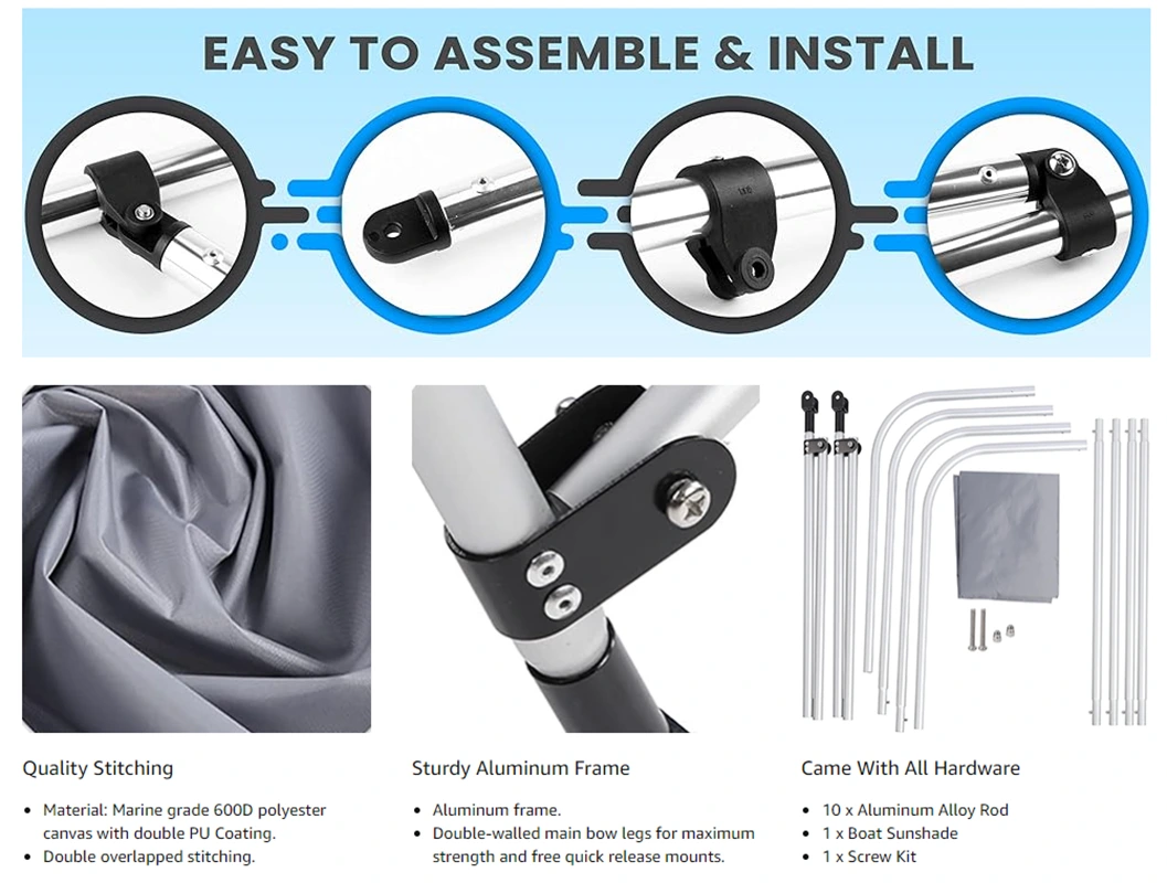 አልሙኒየም ሊሰፋ የሚችል የጀልባ ታንኳ።ለተነፈሰ ታንኳ፣ ካያክ፣ የአሳ ማጥመጃ ጀልባ ተስማሚ። የእኛ የጀልባ ጥላ ከፀሀይ እና ከዝናብ ይጠብቅዎታል፣ለሩናቦውት ጀልባዎች፣V-ኸል ጀልባዎች፣ጆን ጀልባዎች፣ባስ ጀልባዎች፣የሚነፉ ጀልባዎች፣ፋይበርግላስ ጀልባዎችZhejiang Jiayu Outdoor Products Co., Ltd ምንም ልዩ ሳይኖር በጥቂት ደቂቃዎች ውስጥ ሊጠናቀቅ ይችላል። በቀላሉ እና በፍጥነት መጫን እንዲችሉ መሳሪያዎች.