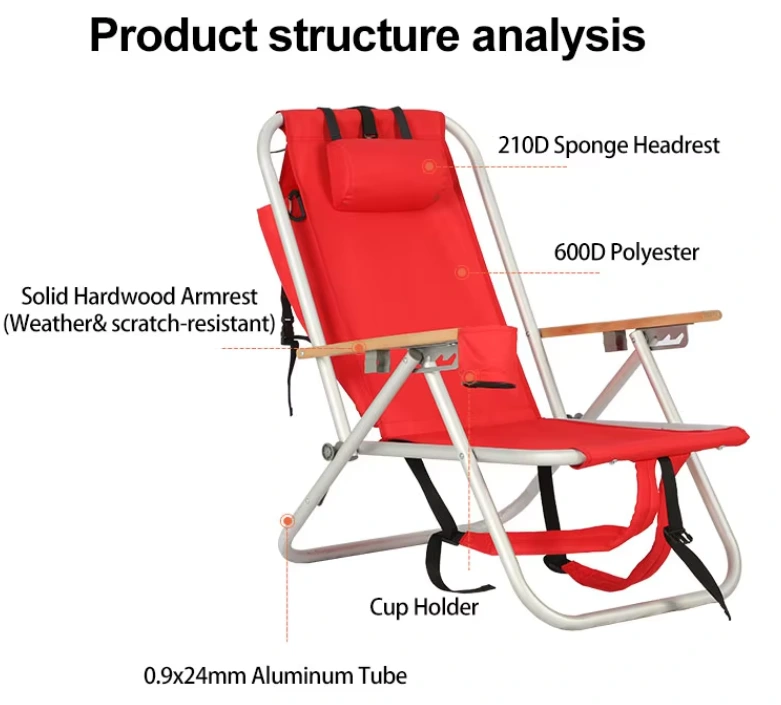 ቀላል ክብደት ያለው የባህር ዳርቻ ሊቀመንበር, ምቹ ማከማቻዎች የላይኛው ማከማቻ እና የመጠጥ ውሃ እና የታችኛው የመመገቢያ ምሰሶዎች.