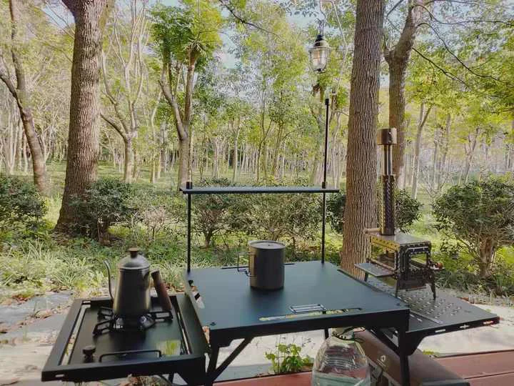 ተንቀሳቃሽ አለም ብረት ብረት ብረት ካምፕ ሰንጠረዥ. ከጠረጴዛው አናት ላይ የተያያዙት ዘይት እና ቅባት በጣም ቀላል ሊሆን ይችላል. እቃዎችን እርጥብ እንዳይሆኑ ለመከላከል የማጠራቀሚያው ክፍሉ ከሽሽሽ ዘይቤ ጋር የተቀየሰ ነው.
