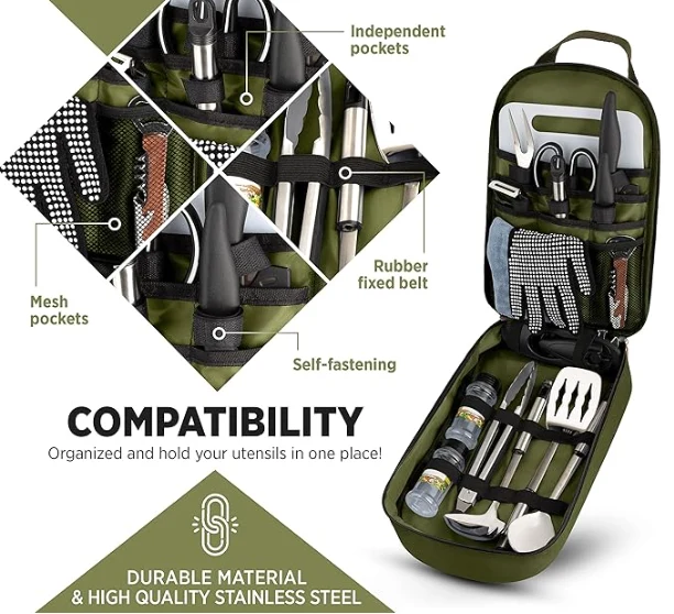 ተንቀሳቃሽ ከቤት ውጭ ካምፕ ቦርሳ, እያንዳንዱ ዕቃ የራሱ የሆነ ዋልታ አለው, ስለሆነም አሃዶች ማሽከርከር, በማከማቸት ወይም በሽግግር ውስጥ መቧጠጥ ወይም ተጎድተዋል. ለማብሰያዎ ዕቃዎችዎ ቀላል መዳረሻን ያቀርባል እና ደህንነቱ የተጠበቀ ዚፕ ማኅተም ያዘጋጃል